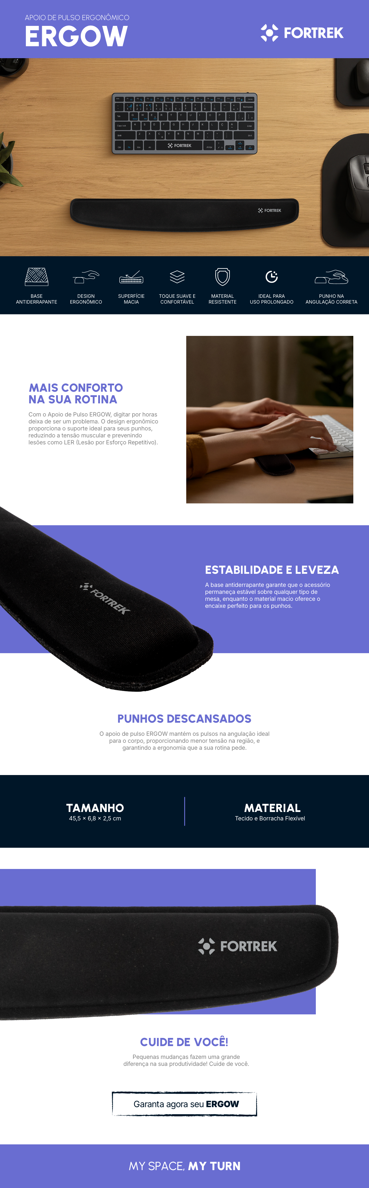 Com design anatômico e fabricado com materiais de qualidade, o apoio de punho Fortrek garante firmeza na mesa e suavidade no toque, tornando o trabalho, estudo ou jogatina muito mais agradáveis. Se você procura por almofada de pulso para mousepad, apoio ergonômico para teclado ou até mesmo suporte de punho para escritório, o modelo Ergow é a solução perfeita.
