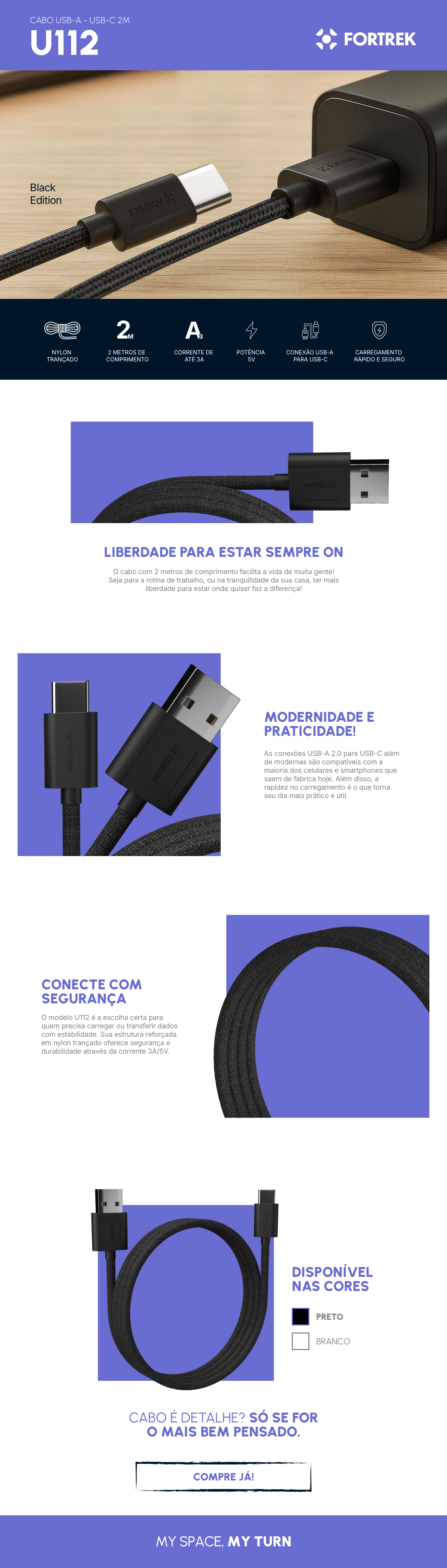 Se você procura um cabo de dados USB-C durável e eficiente, o U111 da Fortrek é a solução perfeita para levar praticidade para os seus momentos.