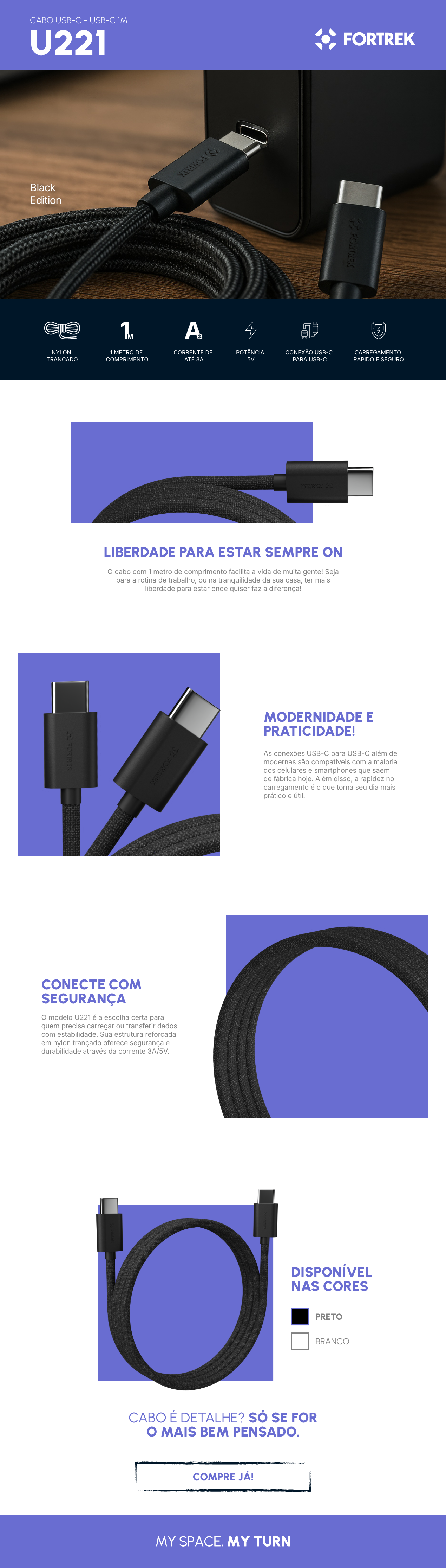 Cabo USB-C Para USB-C Fortrek U221 1 Metro Preto