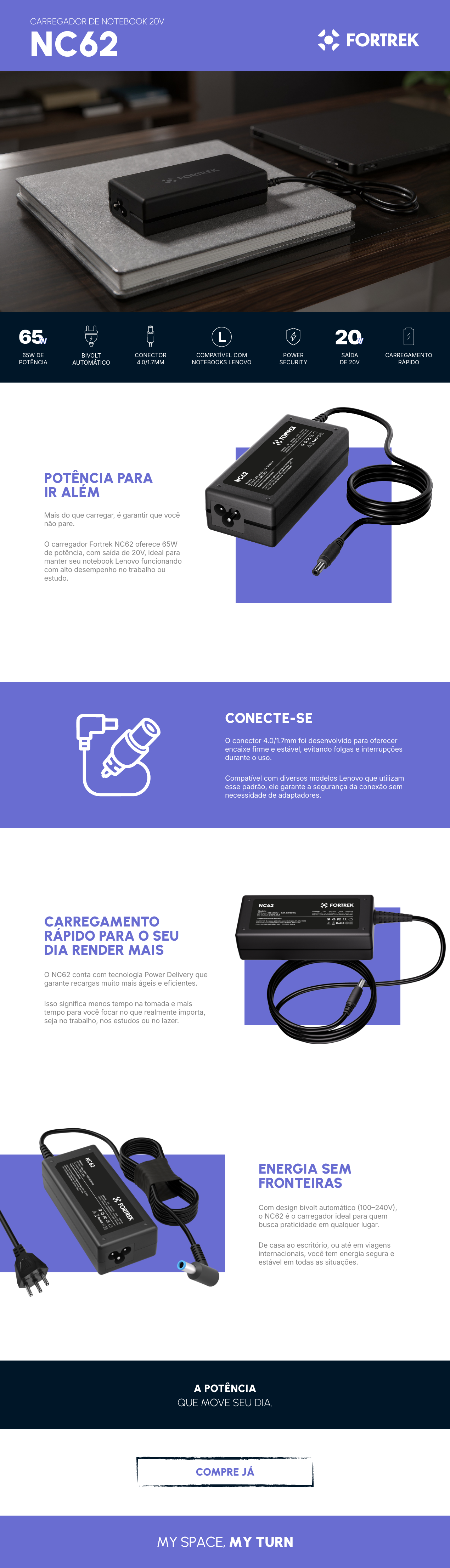 Garantindo praticidade e segurança em um só modelo, o carregador Lenovo Fortrek NC62 65W, foi feito para você que procura uma solução prática para substituir o carregador de notebook Lenovo original, sem perder a qualidade.