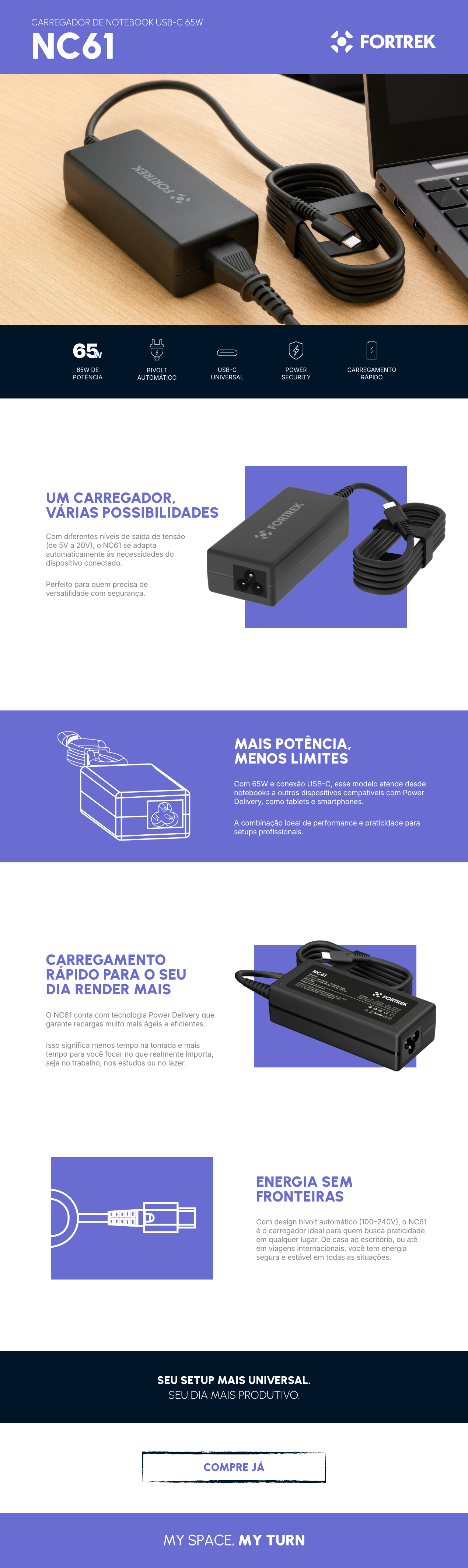 O Carregador de Notebook USB-C Fortrek NC61 é a escolha ideal para quem busca um carregador universal para notebook USB-C que ofereça potência para manter o dispositivo sempre pronto para uso.