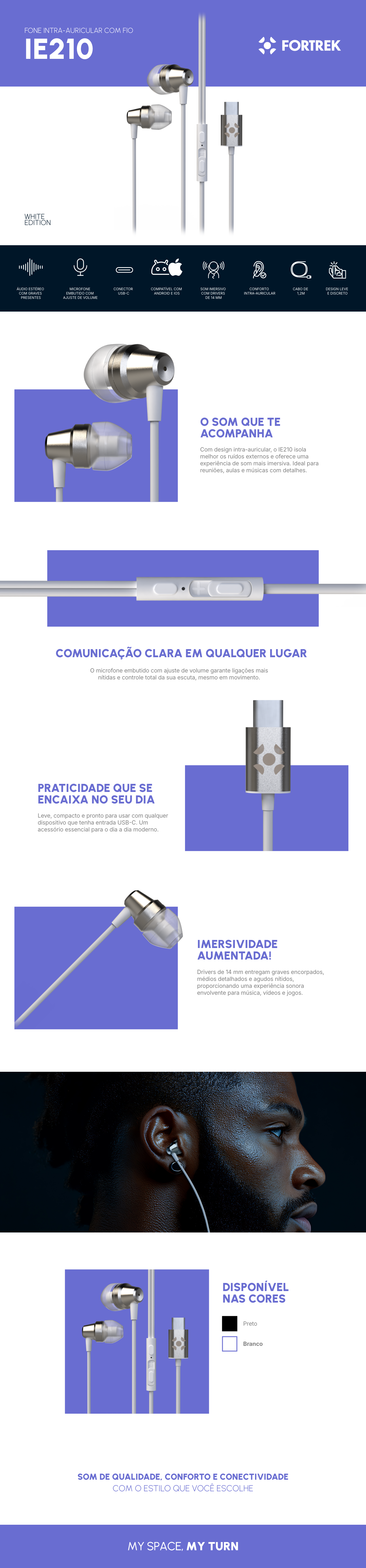 Com o Fortrek IE210, você tem um fone de ouvido com fio tipo-C que une qualidade, conforto e praticidade em qualquer situação. Descubra a diferença de ouvir com mais clareza e escolha já o seu.