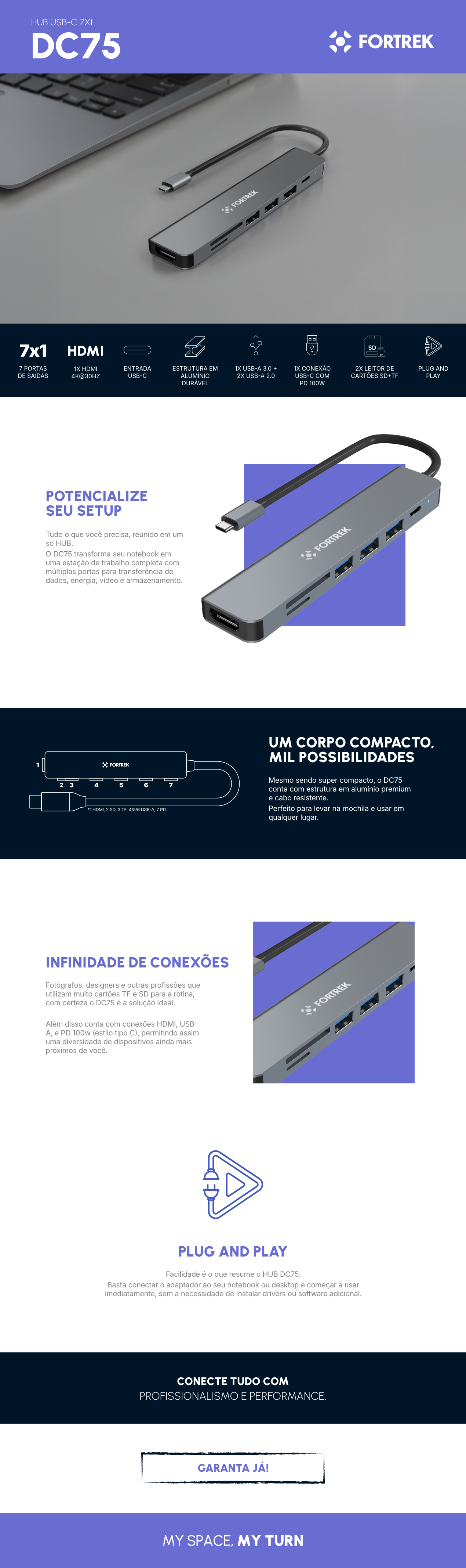 Compatível com diversos dispositivos, o modelo é um hub plug and play, ou seja, basta conectar e usar, sem necessidade de drivers ou instalações adicionais. Diferenciais do Hub USB-C 7 Portas Fortrek DC75: