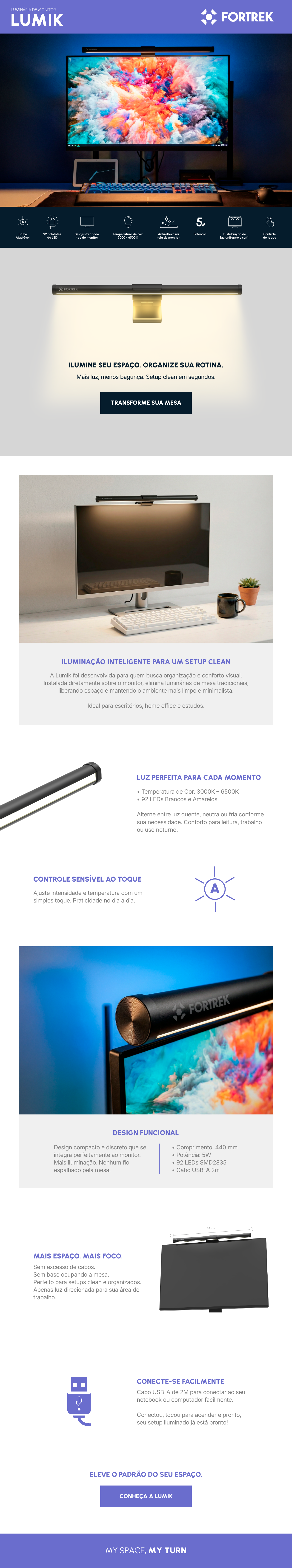 Se você precisa de uma luminária de LED para monitor, barra de luz para monitor, luminária para home office ou iluminação para setup gamer, a Fortrek Lumik une tecnologia, funcionalidade e elegância em um único produto.
