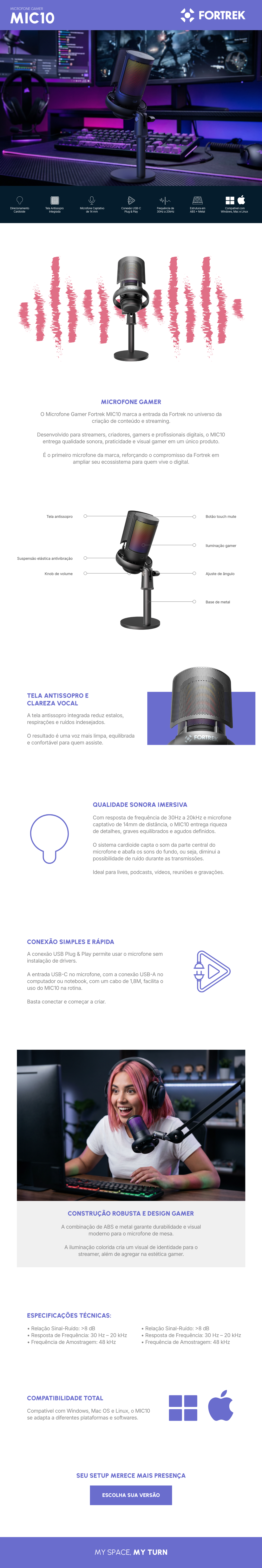 Microfone Gamer Fortrek MIC10 foi desenvolvido para streamers, gamers, criadores de conteúdo e profissionais digitais que exigem áudio limpo, estável e profissional. Seu padrão polar cardioide prioriza a sua voz, reduzindo sons indesejados do ambiente, tornando-o ideal para lives, gravações, reuniões online, podcasts e vídeos para redes sociais.